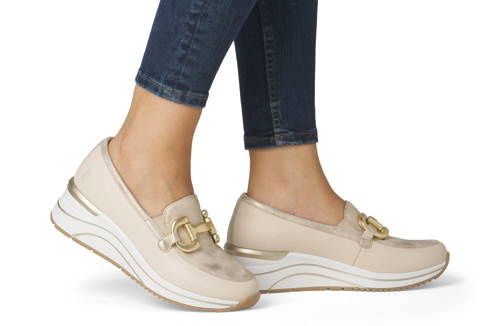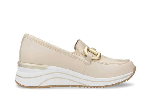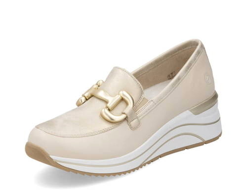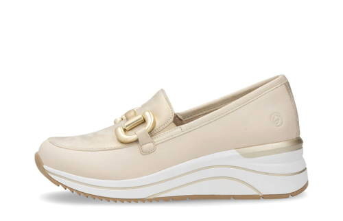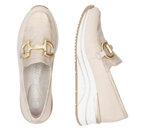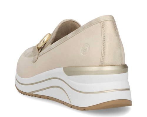 Tieto mokasíny sú dokonalou kombináciou štýlu, pohodlia a elegancie. Mokasíny na miernom klíne REMONTE spájajú moderný štýl a komfort bez kompromisov. Béžový zvršok s výraznou zlatou ozdobou v oblasti priehlavku okamžite zaujme a dodá Vašim outfitom trendy nádych.